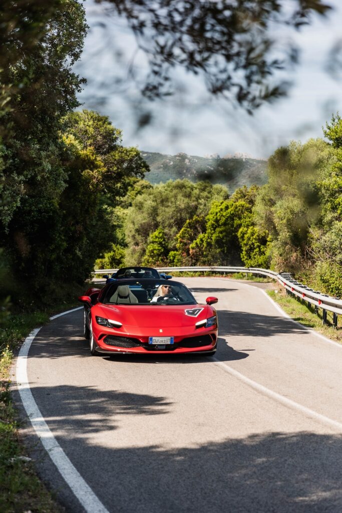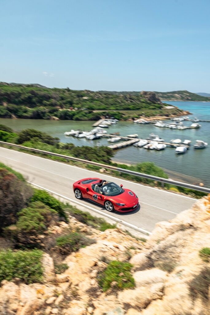 Ferrari 296GTS driving on the road to Porto Cervo.