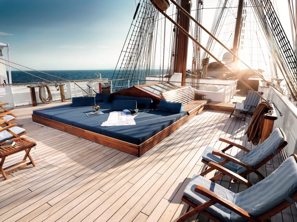 First, the ceremonial setting of the sails ensured quite the show – all 23 of them, crisp, white and open to dazzling effect. A trio of Zodiac inflatable crafts were launched to offer unparalleled views of SeaCloud II in all her glory (an absolute necessity, as for all the delights to be found on deck, it’s impossible to properly see the ship while sailing on her) against the backdrop of those calm azure waters. Later in the afternoon, a perimeter of floats was established in the sea on the starboard side, allowing for a spot of swimming in the open waters. I’d expected to find the concept of bobbing around with 3,000 metres of Mediterranean beneath me mildly terrifying. It was, instead, a heady blend of the exhilarating and the blissful, and an activity I’m grateful I took the time to enjoy.